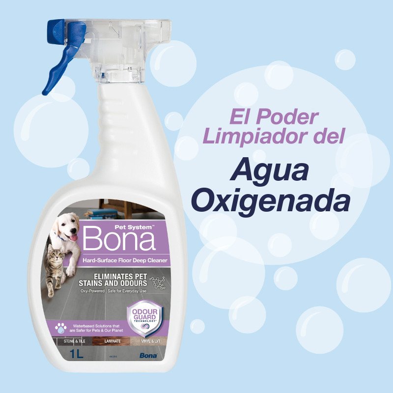 EL Limpiador para Limpieza Profunda de Suelos Laminados y Superficies Duras Bona Pet System™ ofrece una solución oxigenada que limpia en profundidad y penetra en las manchas difíciles e incrustadas, en la suciedad de las mascotas y neutraliza los olores de los accidentes.