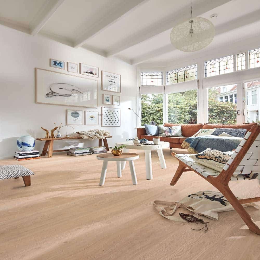 Antiestático, resistente al agua y totalmente resistente a los arañazos, el MeisterDesign. laminate LL 150 es el suelo laminado inteligente para todas las aplicaciones. Con su espesor de 8 mm y una categoría de utilización 23 | 32 AC4, es apropiado para áreas domésticas de uso muy frecuente, como el cuarto de baño, o áreas comerciales (p. ej., tiendas o restaurantes). El tablón XXL, con sus más de 2 m de longitud, tiene una apariencia bastante inusual y demuestra su categoría especialmente en estancias amplias.